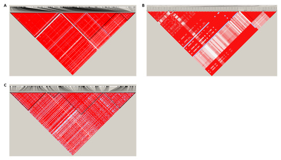 Linkage disequilibrium (LD) plot generated using Haploview software. LD is displayed as pairwise D’ values. Each color represents the magnitude and significance of pairs LD, and the gradation from red to white is from a high LD value to a low value. Red diamonds without numbers correspond to a D’ value of 1.0. (A) S4_34033252, (B) S3_20312675, (C) S1_6459856.