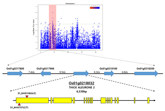 Brach et al. [42] performed a GWAS analysis using high-quality re-sequencing data for 10 eating and cooking quality (ECQs), in a core collection consisting of 227 non-glutinous genetic resources and four derived resources. In addition, diverse resources, consisting of 751 rice accessions from the 3000 Rice Genomes Project [43], were analyzed through GWAS, to dissect the genetic basis of GNC and GCC mutations, which are important determinants of grain yield and quality [44]. In this study, GWAS was performed using high-quality resequencing data from a 294 rice core collection and phenotypic data, and using a staining method with verified significance. It was confirmed that significant SNPs were detected based on −log10(p) > 5 in a Manhattan plot, according to the thickness of the seed coat and aleurone layers. In addition, the expected p-value of the x-axis and observed p-value from significant SNPs showed a diagonal linear shape in the QQ plot, which means that the discovered SNPs expressed their characteristics well, with normality and significance. In the results of the LD block analysis, based on the SNP with the highest correlation according to thickness of seed coat and aleurone layers, various LD blocks were observed on chromosome 1, 3, and 4; among them, S1_6459856 was determined to be a significant SNP, and ROS1 was selected as the closest candidate gene. As a result of the haplotype analysis with Os01g0218032, on the basis of the high peak position of rice chromosome 1, the Os01g0218032 gene was divided into two groups. The Os01g0218032-Hap1 group, showing a thick seed coat and aleurone layers, had a base similar to Nipponbare in the exon region, whereas the Os01g0218032-Hap2 group, showing a thin seed coat and aleurone layer thickness, had a base substitution at the exon region.