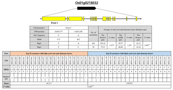 Among them, Os01g0218032 was annotated as repressor of silencing 1a (ROS1a), THICK ALEURONE 2, which displayed functions as DNA demethylase and is related to endosperm development [40]. Os01g0218032 has a gene structure as shown in Figure 6 and is 6.5 kb in length and consists of 17 exons. As a result of identifying allelic mutations of the Os01g0218032 gene in the 294 rice core collection, two missense mutations were found in the first exon of the Os01g0218032 gene. Of the total resources, 74 resources had SNP mutations at the location C6444737T, resulting in mutations from serine to phenylalanine at amino acid location 163. In addition, 76 of the total resources produced SNP mutations at location A6445148C, resulting in mutations from lysine to threonine at amino acid location 301. In the Exon1 region of OsROS1, a total of six SNPs close to S1_6459856 formed LD blocks in the same block as S1_6459856. This is a result of revealing that there is an LD relationship between SNPs. Among the SNP markers in which the LD block was formed, the haplotype for each individual was estimated using Haploview for S1_6444737 and S1_6445148 (Figure 7). For haplotype analysis, the Nipponbare nucleotide sequence was used as standard. The haplotype analysis results and phenotypic data were compared and analyzed, to determine whether there was a relationship between the thickness of seed coat and aleurone layers and the candidate gene. As a result of the haplotype analysis with Os01g0218032, on the basis of the high peak position of rice chromosome 1, the Os01g0218032 gene was divided into two groups. The average thickness of each group was 103.41/73.53 in the thickest part, 50.77/40.04 in the middle part, and 16.12/16.34 in the thinnest part. There was a significant difference among the three genotypes in their thicknesses (with averages of 103.41, 50.77, and 16.12 px) of rice seed coat and aleurone layers. The Os01g0218032-Hap1 group, showing a thick seed coat and aleurone layer, had a base similar to Nipponbare in the exon region, whereas the Os01g0218032-Hap2 group, showing a thin seed coat and aleurone layer thickness, had a base substitution at the exon region.