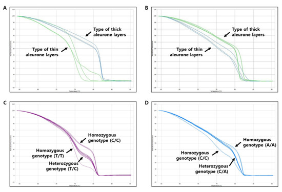 Molecular markers associated with the seed coat and aleurone layers were developed for high resolution melting (HRM) analysis. HRM specific primer sets based on target SNPs were designed using the web-based software Primer3plus (https://primer3plus.com accessed on 23 September 2020) [39]. HRM analysis was conducted using the ECO48 Real-time PCR System (PCRmax, Staffordshire, UK). A total of 20 μL of reaction mixture contained 40 ng of DNA template, 10 μM of each primer, and 10 μL of 2X qPCBIO HRM mix (PCR Biosystems Ltd., London, UK), including a SybrGreen fluorescent dye. PCR amplification was conducted with the following conditions: 95 °C for 5 min; 40 cycles of 95 °C for 15 s, 60 °C for 15 s, and 72 °C for 30 s. For HRM analysis, PCR amplicons were denatured at 95 °C for 15 s and then held at 55 °C for 15 s, to anneal the DNA duplexes. These steps were followed by a melting curve ranging from 65 to 95 °C, with temperate increments of 4.4 °C per second. The fluorescence data were processed to generate melting curves for SNP calling using the ECO48 Software (PCRmax, Staffordshire, UK).