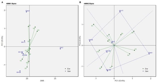 Figure 2. (A) AMMI1 biplot (B) AMMI2 biplot of DRR of five selected accessions and the check variety of C. caesia germplasm for eleven environments.