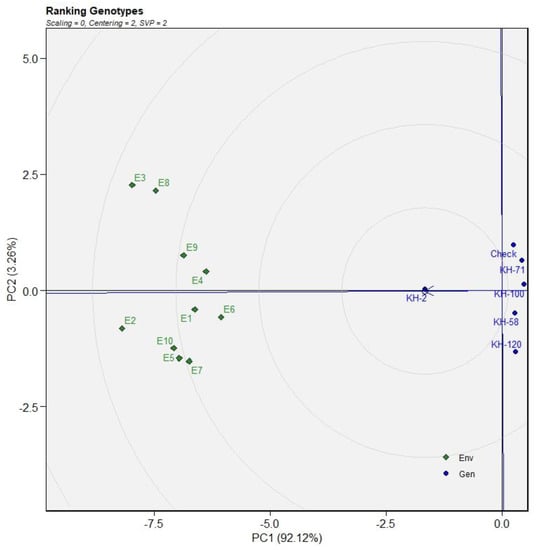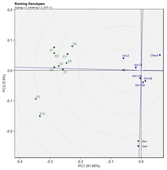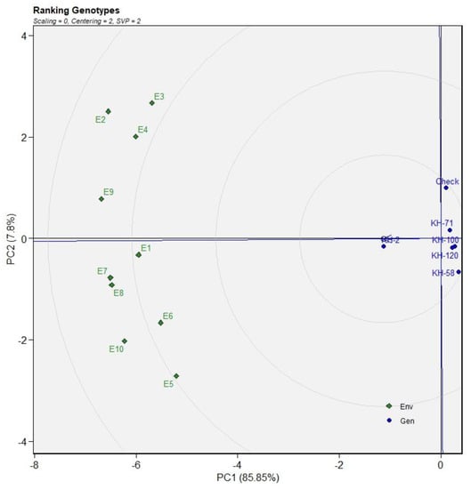 AMMI 2 biplot indicated KH-100, KH-58, KH-71 and the check variety as the high-yielding genotypes (Figure 2B). The genotype KH-100 was the most favourable genotype for the environments E1 and E6, while the genotype KH-58 showed better performance in E5, E8 and E10. The best suited genotype for the environments E7 and E9 is KH-71 while the check variety is most favoured in the E2, E3 and E4 environments. Similar results were predicted in GGE plot with KH-2 as the most consistent genotype, followed by KH-71, KH-100, KH-120, KH-58 and the check variety (Figure 3).