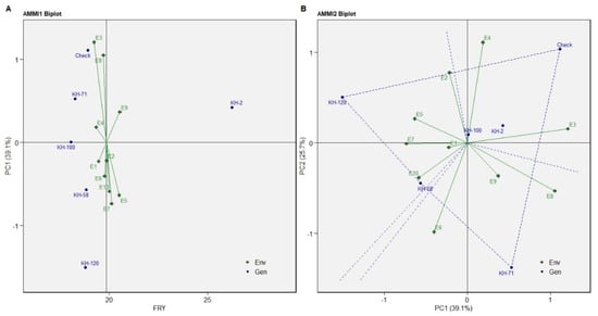 39. Olivoto, T.; Lucio, A.D.C.; da Silva, J.A.G.; Marchioro, V.S.; de Souza, V.Q.; Jost, E. Mean performance and stability in multi-environment trials I: Combining features of AMMI and BLUP techniques. Agron. J. 2019, 111, 1–12. [Google Scholar] [CrossRef]