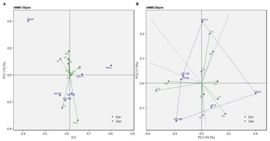 Additionally, the AMMI1 biplot for trait EO yield revealed KH-71 and KH-2 as the stable and high essential oil yielding genotypes. However, KH-71 is more stable compared to KH-2 and KH-2 was high-yielding than KH-71. So, both the genotypes can be considered for EO yield (Figure 6A). In the AMMI2 biplot, it can be observed that genotype KH-71, KH-58, KH-100 and the check variety are high essential oil yielding genotypes in different environments (Figure 6B).