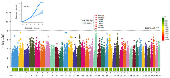 SNPs were annotated to the nearest genes and the most significant SNPs were within or nearby PRDM11, SYT13 (Synaptotagmin 13), TP53I11 (Tumor Protein P53 inducible protein 11), TSPAN18, CD82 (Cluster of differentiation 82), EXT2 (Exostosin Glycosyltransferase 2), ALX4 (ALX Homeobox 4), P2RY1 (Purinergic Receptor P2Y1), and ACCS (1-Aminocyclopropane-1-Carboxylate Synthase) (Figure 2b, Supplementary Table S8). Gene-based association analysis with MAGMA and fastBAT option in GCTA software identified PRDM11, SYT13, TP53I11, ALX4, EXT2, and TSPAN18 as the most significantly associated genes (p < 1 × 10−6) based on the number of SNPs that were significantly associated in these genes from the GWAS analysis (Figure 3). Pathway enrichment analysis of the most significant genes showed enrichment for the following terms or pathways; Cholinergic synapse (cfa04725), Glycerolipid metabolism (cfa00561), Glycosaminoglycan biosynthesis, and Glycoprotein (Table 2).