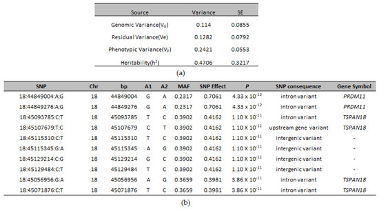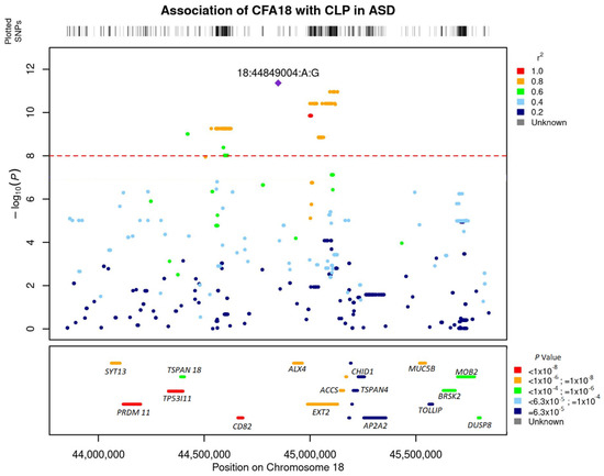 Two hundred twenty-six SNPs reached genome-wide significance. The significant SNPs on CFA18 explained 11.4% of the genetic and 24.21% of the phenotypic variance and explained 47.06% of the heritability of CLP in ASD (Figure 2a).