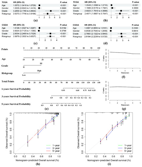 Evaluation of the predictive abilities of the nomogram. Univariable and multivariable Cox regression analyses of age, sex, grade, and risk group in the TCGA (a,b) and CGGA (c,d) cohorts. (e) Prediction of 1-, 3-, and 5-year OS in patients with WHO grade II/III gliomas by utilizing the nomogram. (f,g) Time-dependent C-index plots of the nomogram in both cohorts. (h,i) Calibration curves of the 1-, 3-, and 5-year OS in both cohorts for the nomogram.