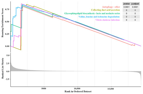 The ‘Autophagy–other’, ‘Collecting duct acid secretion’, ‘Glycosphingolipid biosynthesis–lacto and neolacto series’, ‘Valine, leucine, and isoleucine degradation’, ‘Vibrio cholerae infection’, and other pathways were notably enriched in the high-risk group (Figure 5). Some of these pathways have been implicated in the survival of glioma patients. Our findings suggest possible mechanisms underlying the worse survival outcomes of high-risk patients.
