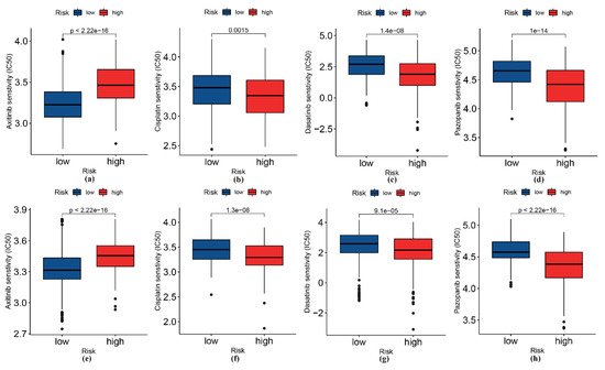 Sensitivity analysis between the high- and low-risk groups for four drugs: axitinib, cisplatin, dasatinib, and pazopanib. (a–d) TCGA cohort. (e–h) CGGA cohort.