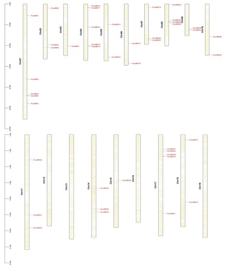 Chromosomes location of PyunBBX genes. The scale on the left is in megabases (Mb). The yellow lines within each chromosome represent gene density.