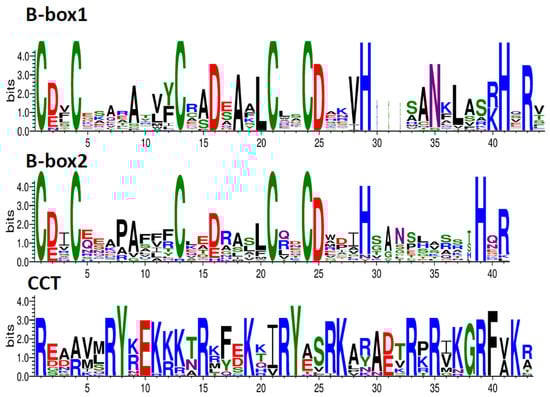 B-box1/B-box2 and CCT conserved domains and corresponding hidden Markov models (HMM) of BBX protein sequences in P. yunnanensis. The X-axis represents the conserved sequences of the domain. Conservation of each residue across all proteins is indicated by the height of each letter. The Y-axis is a scale of the relative entropy, which reflects the conservation rate of each amino acid.