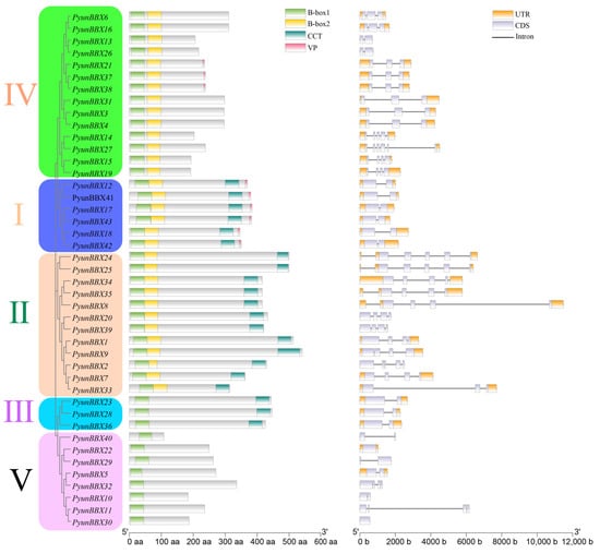 The phylogenetic tree and gene structures of PyunBBX genes. ML method with 1000 bootstrap replications to construct a phylogenetic tree. Starting from the left, the first scale below represents the number of amino acids (aa), and the second scale represents the number of bases (b).