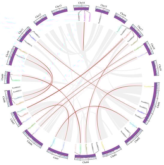 Gene duplication and synteny analysis of PyunBBX genes. The purple circles represent chromosomes. The outermost circle represents gene density, and the scale represents the number of bases (Mb). The 14 putative segmental-duplicated pairs of PyunBBX genes are linked by red lines, and the gene names are shown in the same color. The gray blocks represent replication events that occur on the chromosome of P. yunnanensisg.