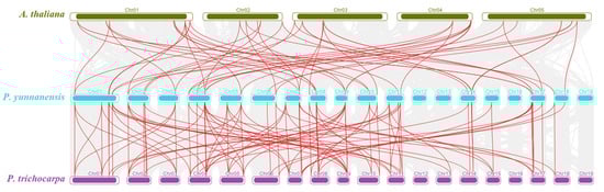 Synteny analysis between P. yunnanensis and the other two species. The putative collinear genes between P. yunnanensis and the other two species are marked in gray, while the syntenic BBX gene pairs are marked in red.