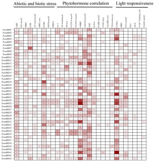 Analysis of cis-acting elements of PyunBBX genes promoters in P. yunnanensis. The number in the box represents the number of cis-acting elements. The shade of the color block depends on the number of cis-acting elements, and the deeper color, the more.