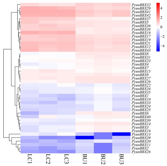 Expression patterns of 43 PyunBBX genes in leaf and bark. The FPKMs of 43 PyunBBX genes are taken as the logarithm with base 10 for standardization; the color patches of different colors indicate the expression levels of PyunBBX genes in the leaf and bark of P. yunnanensis. LC1/2/3: three biological repeats of leaves, BU1/2/3: three biological repeats of bark. The connecting lines on the left represent cluster analysis.