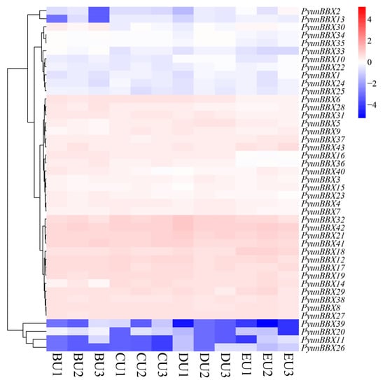 Gene expression levels of 43 PyunBBX genes in different parts of bark. The FPKMs of 43 PyunBBX genes are taken as the logarithm with base 10 for standardization; the color patches of different colors indicate the expression levels of PyunBBX genes in different parts of bark of P. yunnanensis. BU/CU/DU/EU: four positions of bark tissue: BU/CU: above and below the shoot site, DU: at the bottom of the new growth, EU: at the top (Figure S2). The number 1/2/3 represents three biological duplications. The connecting lines on the left represent cluster analysis.