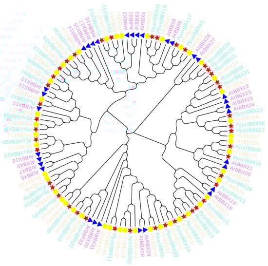 A rooted phylogenetic tree representing the relationships in P. yunnanensis, A. thaliana, and P. trichocarpa. We used the neighbor-joining (NJ) method with 1000 bootstrap replications to construct a phylogenetic tree. The BBX genes of a species are shown by genes name in the same colors and the same shapes in same colors (genes name in green and stars in red: PyunBBX genes of P. yunnanensis; genes name in orange and circles in yellow: PtrBBX genes of P. trichocarpa; genes name in purple and triangles in blue: AtBBX genes of A. thaliana).