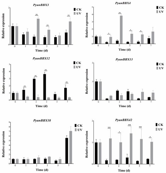 Relative expression analysis of six PyunBBX genes. CK: control check; UV: UV treatment; *: significant correlation at the 0.05 probability level; **: significant correlation at the 0.01 probability level; ***: significant correlation at the 0.001 probability level. Error bars indicate the SD of three independent biological and technical replicates. Time (d): days after UV treatment for 12 h a day.