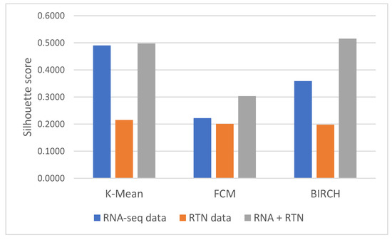Silhouette Coefficient analysis of different features and clustering methods. Silhouette Coefficient scores were calculated for clusters generated with three methods (as denoted in the graph): K-means, FCM and BIRCH. Briefly, the Silhouette Coefficient reflects the ratio between the average geometric distance between patients in the different clusters to patients in the same cluster. Silhouette Coefficient values range from −1 to 1, with a value of 1 reflecting perfect separation between clusters. Each of the clustering methods was applied to three datasets, differing only in the features they involve: the first included only RNA-seq data (blue); the second included only RTN-derived features (Orange); and the third included both kinds of features (gray).