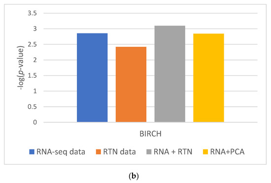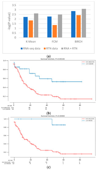 The difference in survival between the groups defined with different features. (a) The difference in survival was compared using the log-rank test for RNA-seq data (blue), RTN-derived features (orange) and both of them (gray). The clustering calculations were performed with 3 algorithms (denoted in the figure). The survival of the patients assigned to the two clusters was then compared, using the log-rank test. The difference in survival is expressed as -log(p-value) of the log-rank test, such that high values indicate a more significant difference in survival. (b) A Kaplan–Meier survival analysis plot of the clusters formed with RNA-seq data alone (161 patients), using the BIRCH clustering algorithm. Patients assigned to one cluster (red) are constructed with patients assigned to a second, smaller cluster (blue). (c) A Kaplan–Meier survival analysis plot of the clusters formed with RNA-seq- and RTN-based features (134 patients), using the BIRCH clustering algorithm. Patients assigned to one cluster (red) are constructed with patients assigned to a second, smaller cluster (blue).