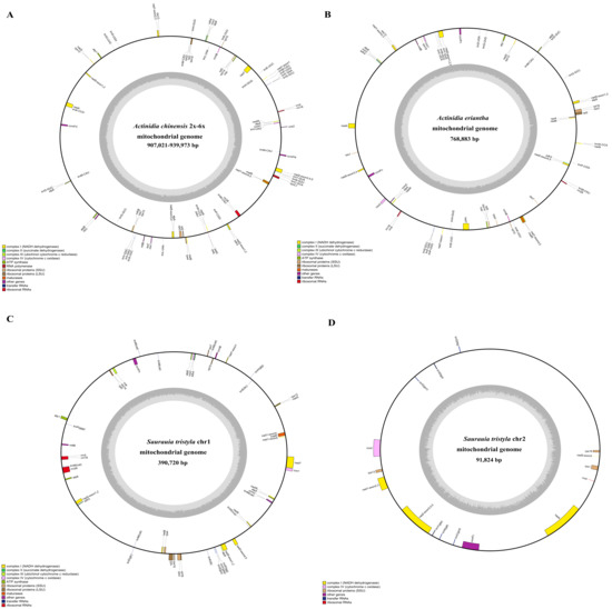 (A–D) Gene map of four kiwifruit species (A. chinensis (2×–6×), A. eriantha) and S. tristyla, representing the mitogenome structure. Genes drawn outside the circle are transcribed clockwise, and those inside are counterclockwise. Genes that belong to different functional groups are color coded. The darker grey in the inner circle indicates the GC content of the mitogenome.