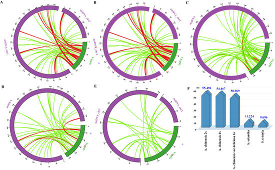 (A–E) Shared genome regions of each species between chloroplasts and mitochondria of A. chinensis (2×), A. chinensis (4×), A. chinensis var deliciosa (6×), A. eriantha and S. tristyla, respectively. The green circular segment represents the mitogenome, and the purple circular segment represents the chloroplast genome. (F) Shared sequence length of each species between chloroplasts and mitochondria genomes.