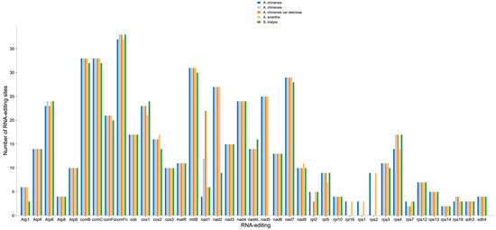 As shown in Figure 4, the RNA editing sites of 39 PCGs of the mitogenomes of 5 Actinidiaceae plants were predicted in this study. Three cytochrome c biogenesis genes, including ccmFn, ccmB, and ccmC, displayed the most RNA editing sites in five Actinaceae sp. plants. Interestingly, we found that the number of NAD1 gene RNA editing sites in A. chinensis var deliciosa was significantly higher than in the other species (Figure 4). Only the rpl2 gene in the A. chinensis (4×) had no RNA editing sites (Figure 4). The rpl16, rps1, and rps2 genes contained the same number of editing sites in the A. chinensis (2×) and A. eriantha, but not in the other species (Figure 4).