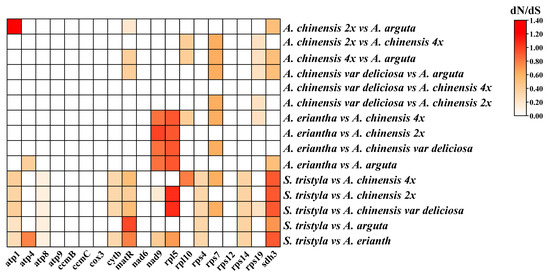The pairwise Ka/Ks ratios among each mitochondrial gene in the six Actinidiaceae family species.