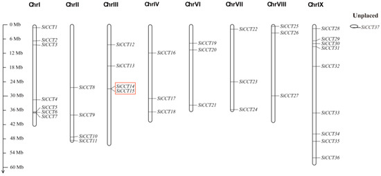 Chromosomal location of putative SiCCT genes. Thirty-six genes were mapped to the millet chromosomes, and one predicted gene was not mapped. The chromosome number is shown above each chromosome, and the length of each chromosome is indicated on the left in megabases (MB).