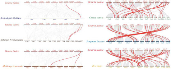 Homology of CCT genes between foxtail millet and six representative plant species. Gray lines in the background represent collinear blocks in the genomes of millet and the other plant species, and red lines highlight collinear CCT gene pairs.