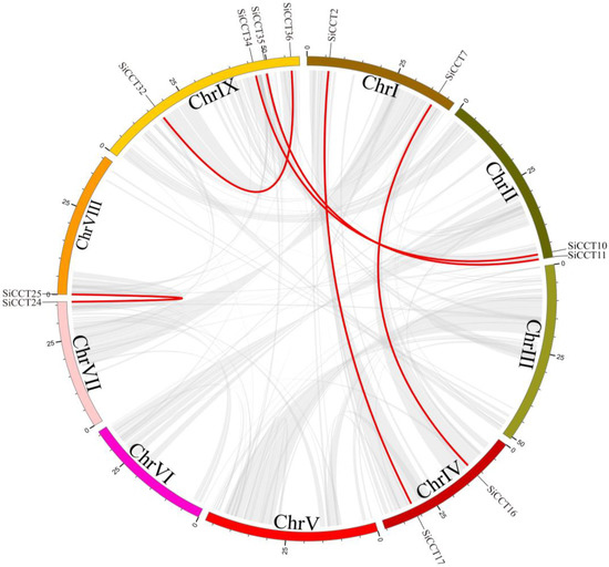 Interchromosomal relationships of millet CCT genes. Gray lines represent all common blocks in the millet genome, and red lines represent replicated CCT gene pairs.