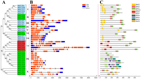 The phylogenetic tree of SiCCTs was constructed and divided into 10 groups (I to X; Figure 5A). To better understand the evolution of CCT genes in foxtail millet, we analyzed the intron–exon structure of the identified CCT genes (Figure 5B). Most SiCCT genes contained one to three introns (eight genes with one intron, seven with two introns, and seven with three introns). A smaller proportion of the genes contained four to eight introns (two genes with four introns, four with five introns, three with six introns, four with seven introns, and one with eight introns). Only SiCCT20 lacked an intron.