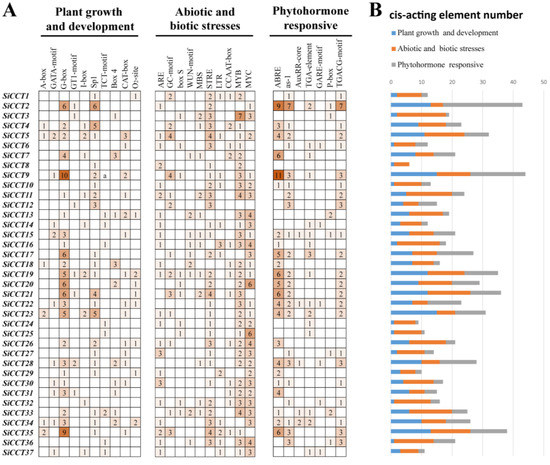 Cis-acting element analysis of the CCT gene family in foxtail millet. (A) Number of different promoter elements in the CCT genes indicated by different colors and numbers. (B) Number of cis-acting elements in three functional categories.