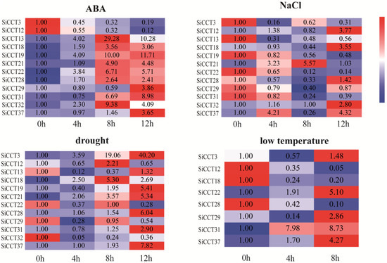 Expression profile of SiCCT genes under different treatments. Red boxes indicate up-regulation; blue boxes indicate down-regulation, and the intensity of the color indicates the intensity of expression. The color intensity of each color block is compared separately for each gene. The numbers on the graph were the expression levels of genes calculated by the 2−ΔΔCt method.