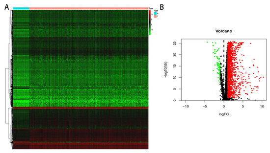 The differential expression analysis in TCGA. (A) Heatmap. (B) Volcano plot. The green dot represents the low-expression genes, the red represents the high-expression genes and the black represents no differential genes in the volcano.