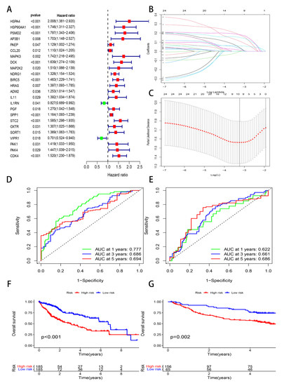 Lasso regression analysis, ROC curve, and Kaplan–Meier survival curves. (A) Univariate Cox analysis. (B) Distribution of the LASSO coefficients. (C) The 10-fold cross-verification of variable selection in the LASSO algorithm. (D) ROC curve in the TCGA cohort. (E) ROC curve in the GSE14520 cohort. (F) Survival curves in the TCGA cohort. (G) Survival curves in the GSE14520 cohort.