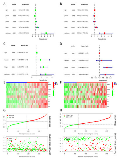 Prognosis of the risk model in two groups. (A) Univariate prognosis analysis in the TCGA cohort. (B) Multivariate prognosis analysis in the TCGA cohort. (C) Univariate prognosis analysis in the GSE14520 cohort. (D) Multivariate prognosis analysis in the GSE14520 cohort. (E) Heatmap of the ten genes’ expression in the TCGA cohort. (F) Heat maps of the ten genes’ expression in the GSE14520 cohort. (G) The overall survival risk scores, survival time, and survival status distribution in the TCGA cohort. (H) The distribution of the overall survival risk scores, survival time, and survival status in the GSE14520 cohort.