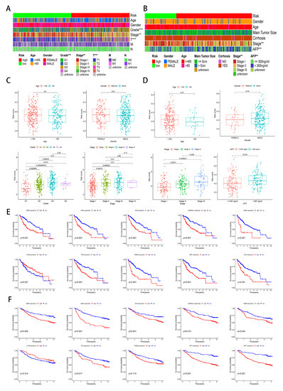 Clinical feature analysis and survival analysis. ** p < 0.01; *** p < 0.001. (A) Heatmap of the clinical correlation in the TCGA cohort. (B) Heatmap of the clinical correlation in the GSE14520 cohort. (C) Box plot of the clinical correlation in the TCGA cohort. (D) Box plot of the clinical correlation in the GSE14520 cohort. (E) The OS of the ten genes in the TCGA cohort. (F) The OS of ten genes in the GSE14520 cohort.