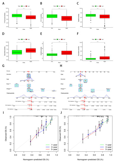 Drug sensitivity analysis and nomogram. *** p < 0.001. (A–F) Drug sensitivity. 5-Fluorouracil (A), VX-11e (B), and sapitinib (C) were more effective in the high-risk group. Selumetinib (D), sorafenib (E), and gemcitabine (F) were more effective in the low-risk group. (G) Nomogram in the TCGA cohort. (H) Nomogram in the GSE14520 cohort. (I) Calibration curves in the TCGA cohort. (J) Calibration curves in the GSE14520 cohort.