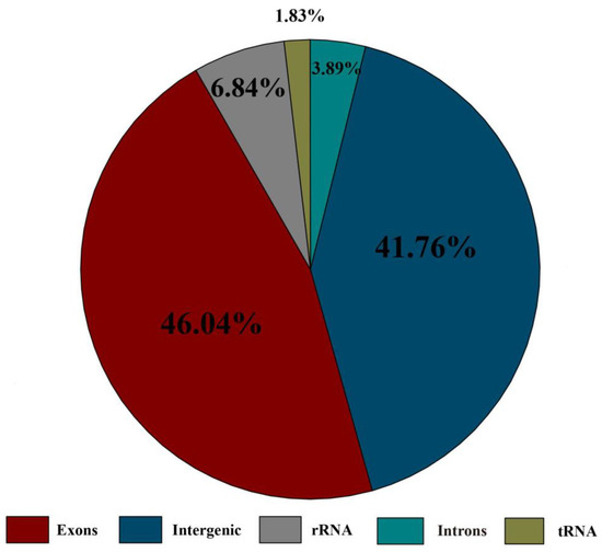 Figure 3. Proportions of the whole chloroplast genome of Trebouxiophyceae sp. DW1. The exons, introns, intergenic sequences, tRNA, and rRNA genes region.