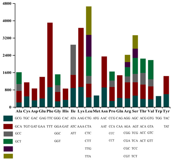 Figure 4. Codon usage in the whole chloroplast genome of Trebouxiophyceae sp. DW1.The x-axis represents amino acids, frequency of codon usage is plotted on the y-axis.