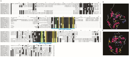 Sequence alignment and structure analysis of PtriZATs. (A). Multiple sequence alignment of PtriZAT proteins with BioEdit. Blue label and letters denote domains of PtriZAT proteins. The codes for shades are: Black, >50% conservation position with BioEdit; Green, same amino acid subunits; Yellow, characteristic bases of C1-2i ZEPs of A. thalina [18]. (B,C). Protein structure of ZnF-C2H2 domains in Potri.004G216900 and Potri.001G295500 using Expasy-ProtParam. Potri.004G216900 model was built using 6ml2.1.A template with 2.7Å X-ray method (0.30 seq similarity, 0.37 coverage, 120–233 range); Potri.001G295500 model was built using 6ml2.1.A template with 1.87Å X-ray method (0.30 seq similarity, 0.36 coverage, 63–148 range).