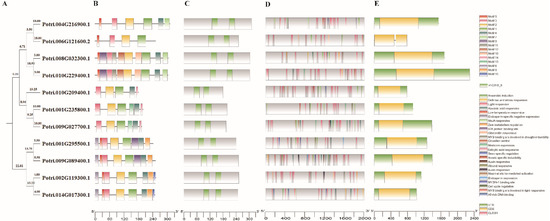 Phylogenetic tree, motifs and structure of PtriZATs. (A). The phylogenetic tree of PtriZATs constructed on the basis of the maximum-likelihood method. (B). The conserved motifs of PtriZATs predicted using various Multiple Em for Motif Elicitation (MEME). The colored boxes represented 15 conserved motifs, the grey lines are non-conserved sequences. (C). A schematic diagram showing the ZnF-C2H2 domains of PtriZATs. The green boxes exhibited the ZnF-C2H2 domains. (D). Cis-elements of PtriZATs during the 2000bp upstream sequences. (E). Gene structures of PtriZAT genes. The yellow box showed the CDS, green ones were no-coding sequences.