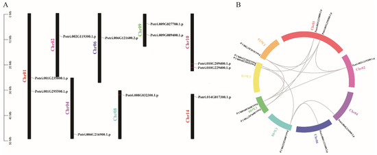 To investigate the possible relationship between PtriZATs, we analyzed their chromosomal location using TBtools (Figure 3). We found eleven PtriZATs genes distributed on eight chromosomes randomly. No PtriZATs were located on chromosome 3, 5, 7, 11, 12, and 13. Except for Potri.001G235800, Potri.001G295500, Potri.009G027700, Potri.009G089400, Potri.010G229400, and Potri.010G209400, other PtriZATs were located on chromosome 2, 4, 6, 8, and 14 separately. Potri.008G032300, Potri.014G017300, Potri.004G216900, Potri.010G229400 and Potri.010G209400 were located on the distal ends of chromosomes 8, 14, and 10. The distribution of PtriZAT genes relative to the corresponding duplication is shown in Figure 3B. Potri.008G032300 was probably the primordial PtriZAT, which replicated to Potri.004G216900, Potri.006G121600, and Potri.010G229400 with genome duplication [30]. The other PtriZATs with synteny contained conserved ZnF-C2H2 domains and belonged to the same subgroup, which probably developed because of genome duplication [30].
