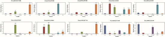 The poplars were gathered from Kunming (E102.74°, N25.17°), and well grown in the culture room of Southwest Forestry University, Kunming, with the cutting method and natural culture conditions. The fresh and healthy leaves, stems, and roots were collected. For drought, ABA, and salt treatment, there was a no-watering protocol (seven days), and 10 μM ABA and 250 Mm NaCl were added into the normal condition. Total RNAs were extracted using the RNAprep Pure Plant Plus Kit (Cat. DP441, Tiangen, Beijing, China) following the manufacturer’s instructions for different tissues and stress treatment plant materials. RNA (1 μg) was used for reverse transcription with an EasyScript® All-in-One First-Strand cDNA Synthesis SuperMix for qPCR reagent Kit (Transgene, Beijing, China). The relative expression levels of individual genes were measured with gene-specific primers (Table S1) by real-time quantitative PCR (qRT-PCR) analysis, which was carried out in a 20 μL reaction mix with 1 μL of diluted cDNA template and TransStart® Green qPCR SuperMix (Transgene, Beijing, China) with a Bio-Rad CFX96. The elongation factor 1 (EF1) served as the internal control [27].