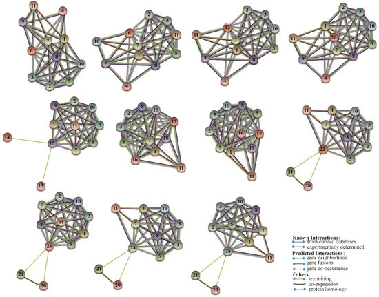 The predicted network of protein–protein interactions of PtriZATs by STRING. The different colors represent different types of interactions. The interaction proteins were as follows: 1, Potri.008G195900; 2, Potri.005G246700; 3, Potri.011G168800; 4, Potri.001G417300; 5, Potri.001G315200; 6, Potri.004G216900; 7, Potri.010G019150; 8, Potri.013G006000; 9, Potri.013G007800; 10, Potri.017G055200; 11, Potri.018G084900; 12, Potri.008G032300; 13, Potri.004G163200; 14, Potri.009G124900; 15, Potri.010G209400; 16, Potri.006G192700; 17, Potri.016G045500; 18, Potri.001G235800;19, Potri.009G027700; 20, Potri.001G143700; 21, Potri.001G173200; 22, Potri.001G295500; 23, Potri.009G089400; 24, Potri.002G119300; 25, Potri.014G017300; 26, Potri.010G229400.