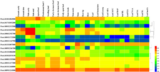 P. trichocarpa and Physcomitrium patens transcriptome data were obtained from Phytozome 13 (https://phytozome-next.jgi.doe.gov/ (accessed on 20 January 2022)). The expression data of PtriZAT genes were used to analyze the expression profile of P. trichocarpa H1 genes at different development stages (female, male, bud, leaf, root, and stem) and treatments (ABA, ACC, BAP, BL, GA, NAA, SA, SL, and meJA). All the expression values demonstrated in the heatmap were calculated with log2 of the FPKM values of Phytozome 13. The heatmap of PtriZAT genes was obtained by Heml 1.0.3 [28].