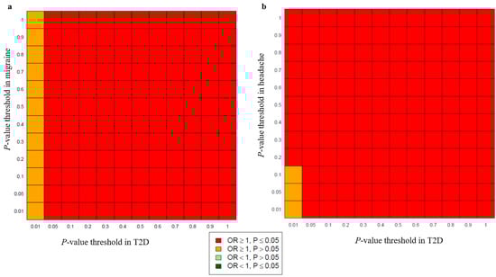 Genetic overlap between migraine and T2D, and headache and T2D. Heatmap plots from SECA exact Fisher tests for SNP effect concordance between (a) migraine and T2D, and (b) headache and T2D. Among the 144 SNP subsets examined, 132 and 141 SNP subsets (red colour in the figure) showed significant concordant effects (OR > 1 and P < 0.05) between migraine and T2D and between headache and T2D, respectively.