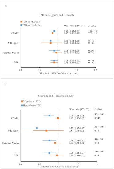 2SMR analysis found no evidence to support a causal effect of T2D (exposure variable) on headache (outcome variable) using the IVW (OR = 0.98, 95% CI: 0.96–1.00, p = 0.12), weighted median (OR = 0.98, 95% CI: 0.95–1.00, p = 0.21), MR-Egger (OR = 0.96, 95% CI: 0.92–1.01, p = 0.12), and MR-PRESSO (OR = 0.99, p = 0.19) models. While GSMR analysis found some evidence for a causal effect of T2D on headache (OR = 0.98, 95% CI: 0.97–1.00, p = 0.01). Reverse 2SMR found some evidence for a causal association of headache on T2D using the primary IVW model (OR = 0.90, 95% CI: 0.84–0.97, p = 7 × 10−3); moreover, in line with the IVW model, the weighted median (OR = 0.90, 95% CI: 0.83–0.97, p = 8 × 10−3) and MR-Egger (OR = 0.77, 95% CI: 0.62–0.97, p = 3.5 × 10−2) sensitivity analyses also found significant evidence for causal association. There was evidence for heterogeneity (Cochran’s Q Pivw = 3.21 × 10−3), although the MR-Egger intercept (p = 0.17) indicated that this was not likely caused by horizontal pleiotropy. Similarly, MR-PRESSO produced a significant raw estimate after excluding two outliers (OR = 0.90, p = 7 × 10−5) and a global test for horizontal pleiotropy (Pglobal-test = 4.7 × 10−3). Furthermore, GSMR found significant evidence for a causal association (OR = 0.90, 95% CI: 0.84–0.95, p = 3.32 × 10−5) (Figure 3 and Table 9).